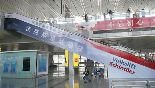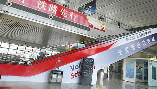 湖州高铁站内沃克斯迅达电梯的画面由科技蓝,换为配合沃克斯迅达电梯新logo色调的灰红搭配,更为庄重也更加鲜活。湖州高铁站大厅左右两部扶梯贴犹如腾飞之翼,将助力沃克斯迅达电梯的全新发展。